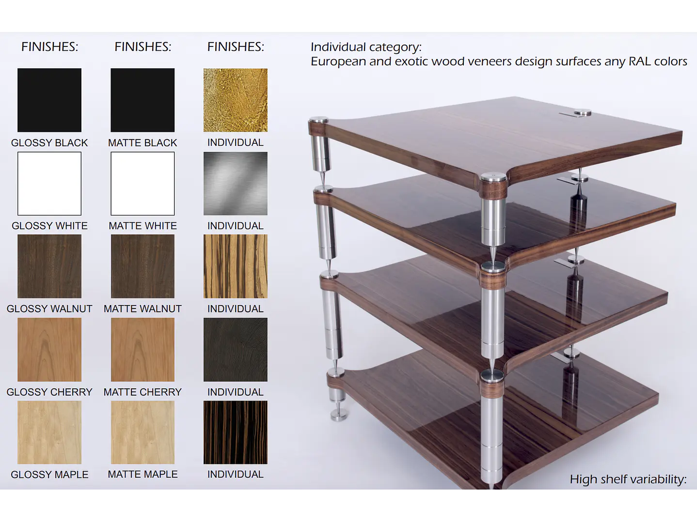 La categoría INDIVIDUAL complacerá a los amantes del diseño. En esta categoría el cliente puede elegir su propio diseño de su rack. Todas las chapas europeas y exóticas, todos los tonos RAL y varias superficies de lujo son para la selección.