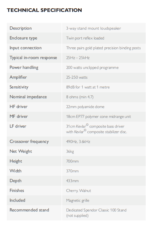 • Para obtener el mejor rendimiento, se recomienda su uso con el soporte dedicado Spendor Classic 100 Stand.